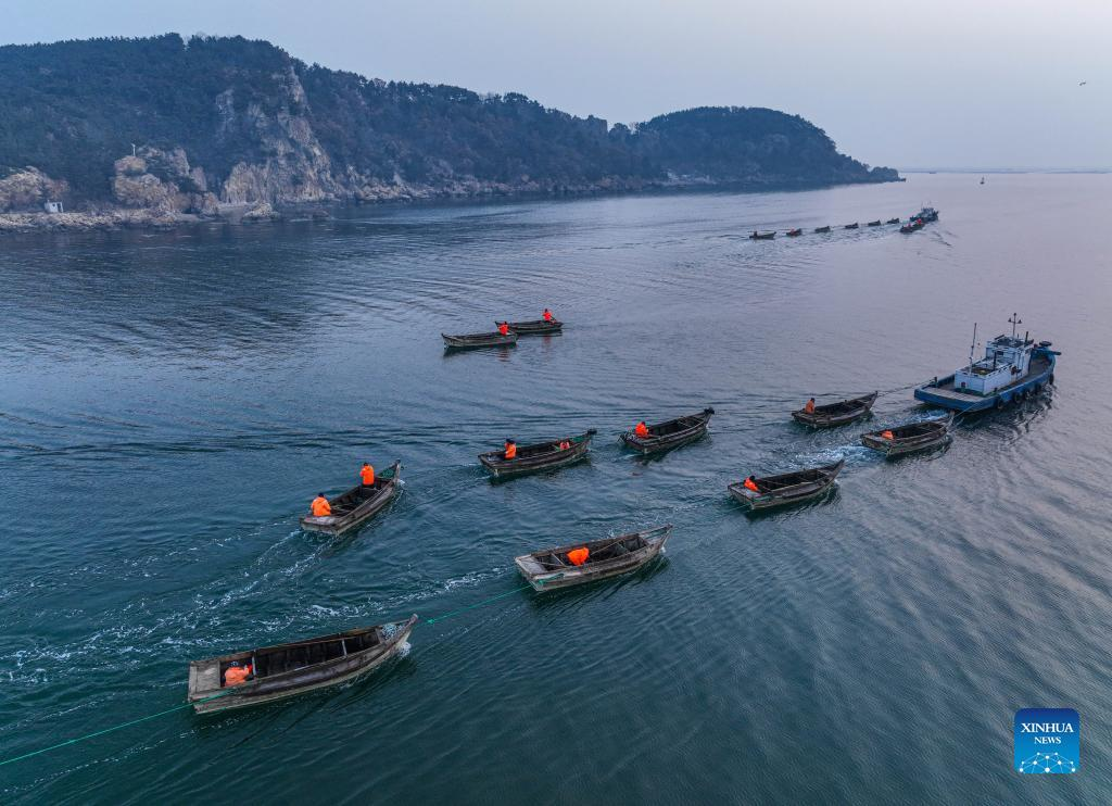 Aerial photo taken on Feb. 11, 2022 shows fishermen on boats and sampans in Lidao Township of Rongcheng City, east China's Shandong Province. (Photo by Li Xinjun/Xinhua)