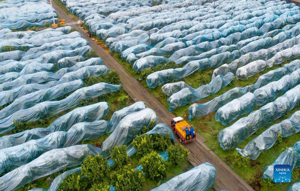Aerial photo taken on Feb. 11, 2022 shows farmers harvesting tangerines in Gengtou Village of Tongdao Dong Autonomous County of Huaihua City, central China's Hunan Province. (Photo by Su Yongzhu/Xinhua)