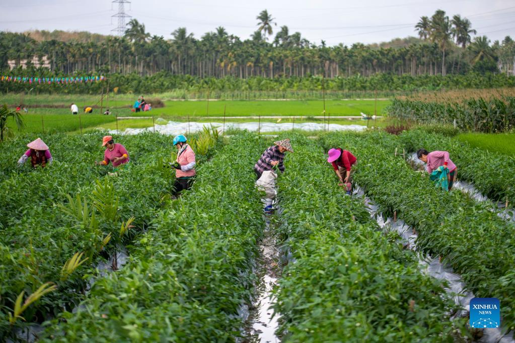 Farmers harvest chili peppers in Jiaji Town of Qionghai City, south China's Hainan Province, Feb. 10, 2022. (Photo by Meng Zhongde/Xinhua)