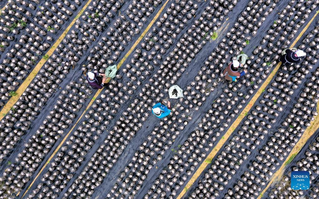 Aerial photo taken on Feb. 11, 2022 shows farmers picking black fungus in Gaojiu Village of Rongjiang County, Qiandongnan Miao and Dong Autonomous Prefecture, southwest China's Guizhou Province. (Photo by Wang Bingzhen/Xinhua)
