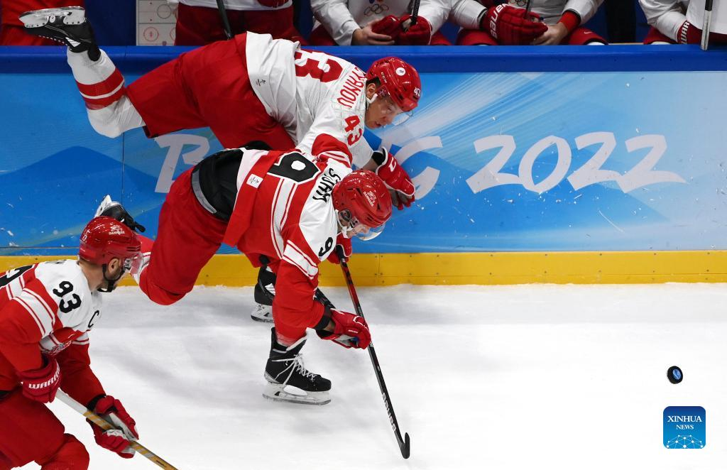 Nicklas Jensen (R) of Denmark attacks during the men's ice hockey preliminary round Group B match between Denmark and ROC at the National Indoor Stadium in Beijing, China, Feb. 11, 2022. (Xinhua/Li He)