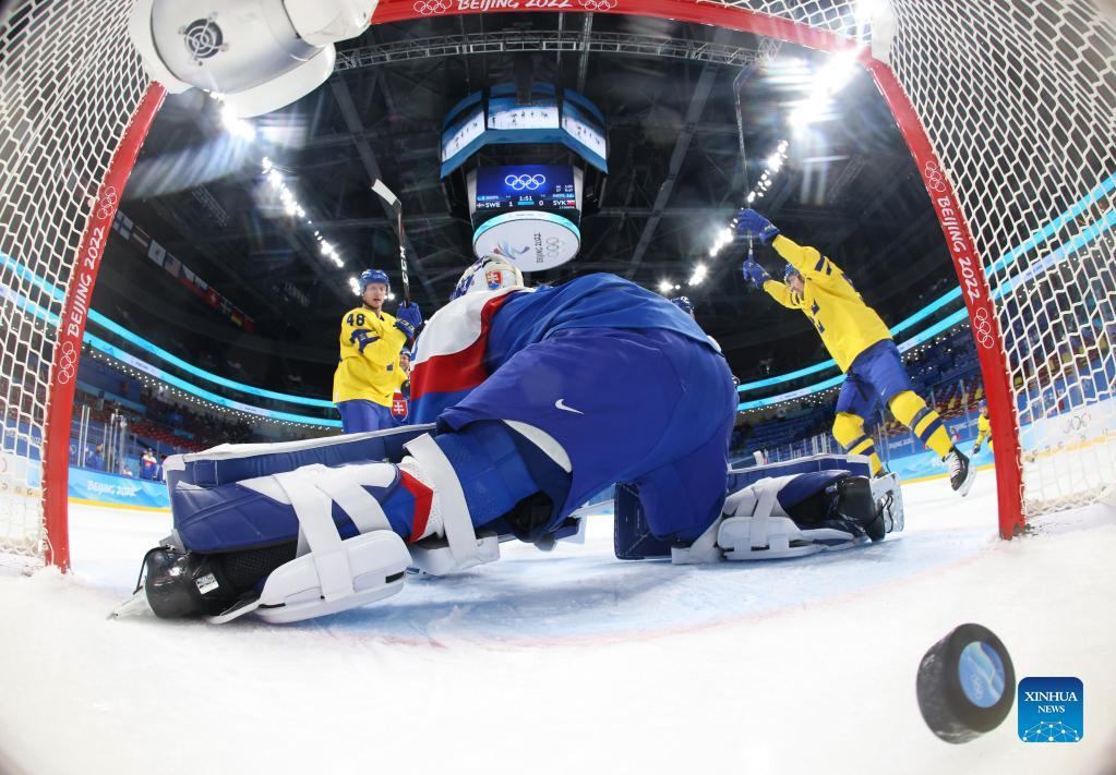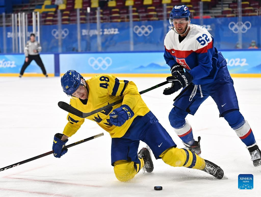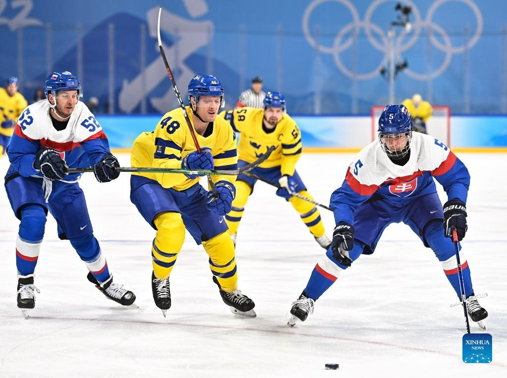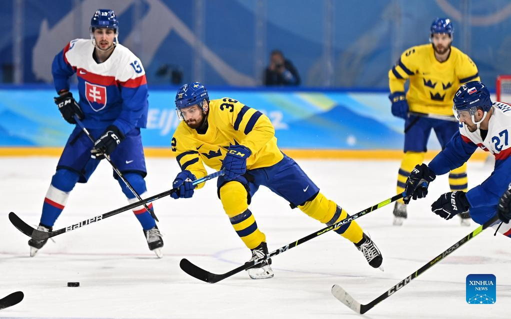 Lukas Bengtsson (C) of Sweden vies for the puck during the ice hockey men's preliminary round Group C match between Sweden and Slovakia at Wukesong Sports Centre in Beijing, capital of China, Feb. 11, 2022. (Xinhua/Song Yanhua)