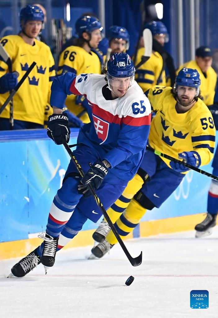 Michal Cajkovsky (L) of Slovakia tries to control the puck during the ice hockey men's preliminary round Group C match between Sweden and Slovakia at Wukesong Sports Centre in Beijing, capital of China, Feb. 11, 2022. (Xinhua/Song Yanhua)