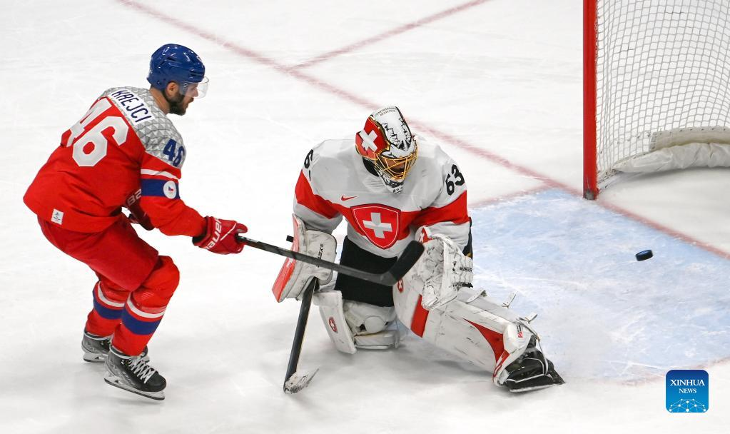 David Krejci (L) of the Czech Republic scores his penalty during the ice hockey men's preliminary round Group B match between the Czech Republic and Switzerland at National Indoor Stadium in Beijing, capital of China, Feb. 11, 2022. (Xinhua/Liu Xiao)