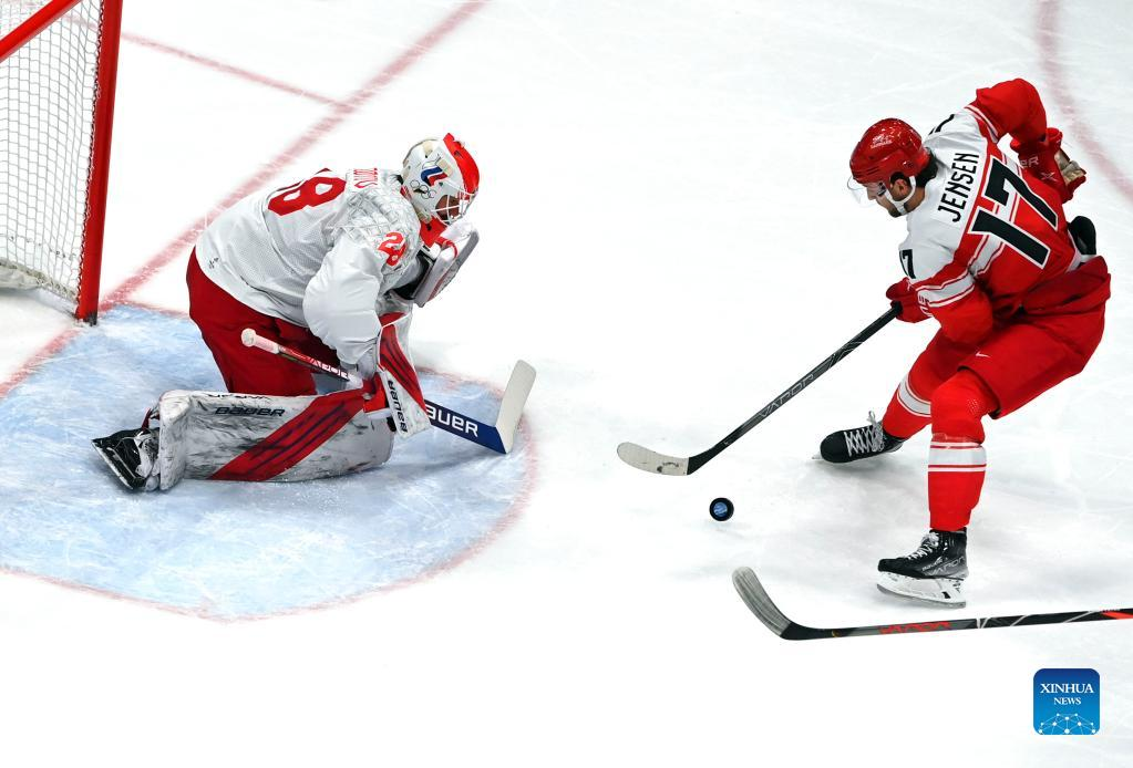 Nicklas Jensen (R) of Denmark shoots during the men's ice hockey preliminary round Group B match between Denmark and ROC at the National Indoor Stadium in Beijing, China, Feb. 11, 2022. (Xinhua/Li He)