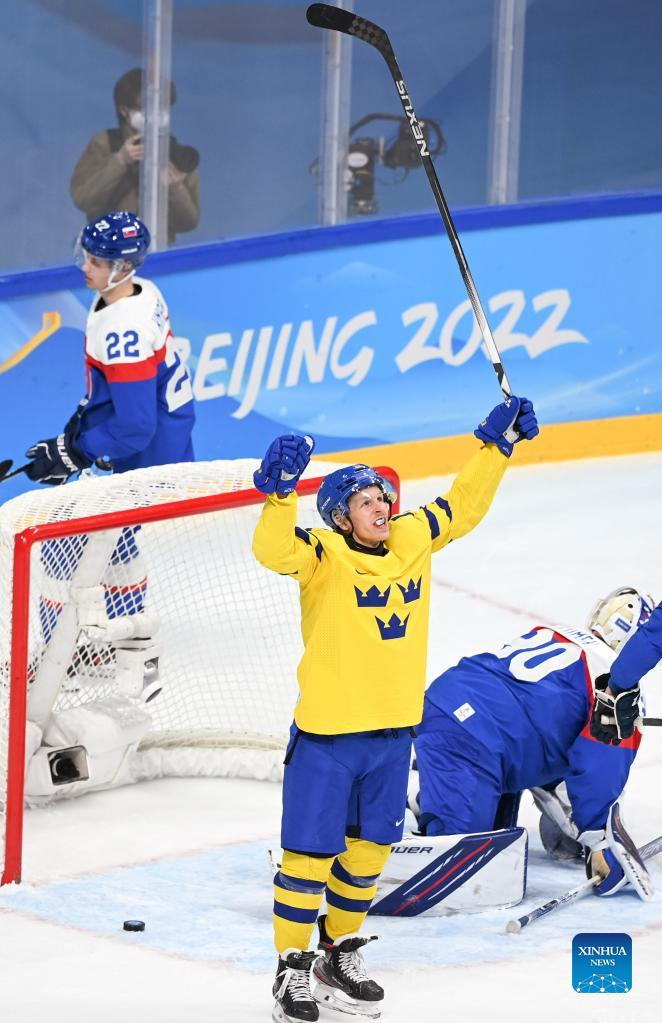 Joakim Nordstrom (C) of Sweden celebrates scoring during the ice hockey men's preliminary round Group C match between Sweden and Slovakia at Wukesong Sports Centre in Beijing, capital of China, Feb. 11, 2022. (Xinhua/Huang Zongzhi)