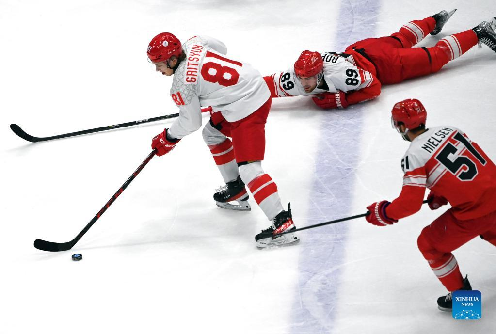 Frederik Storm (C) of Denmark vies with Damir Sharipzyanov (top) of ROC during the men's ice hockey preliminary round Group B match between Denmark and ROC at the National Indoor Stadium in Beijing, China, Feb. 11, 2022. (Xinhua/Li He)