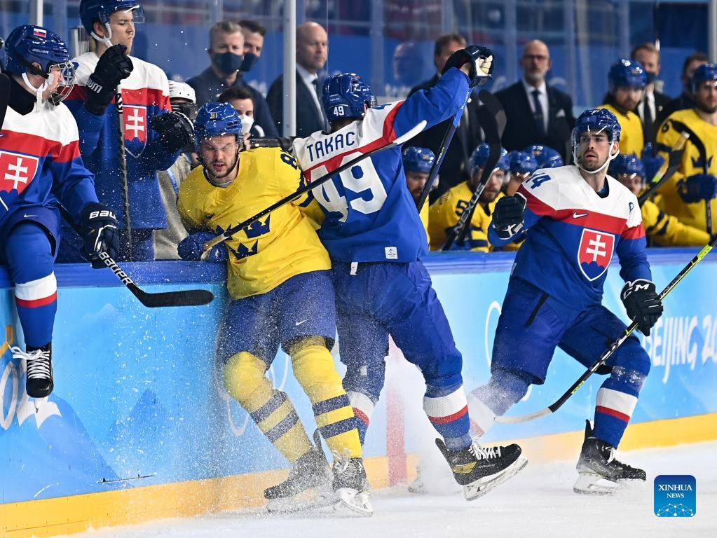 Theodor Lennstrom (C) of Sweden and Milos Kelemen (R) of Slovakia clash during the ice hockey men's preliminary round Group C match between Sweden and Slovakia at Wukesong Sports Centre in Beijing, capital of China, Feb. 11, 2022. (Xinhua/Huang Zongzhi)