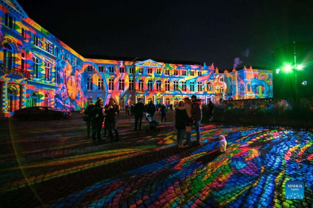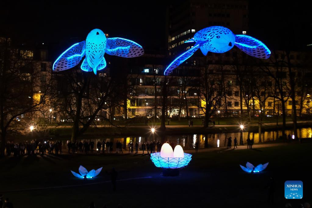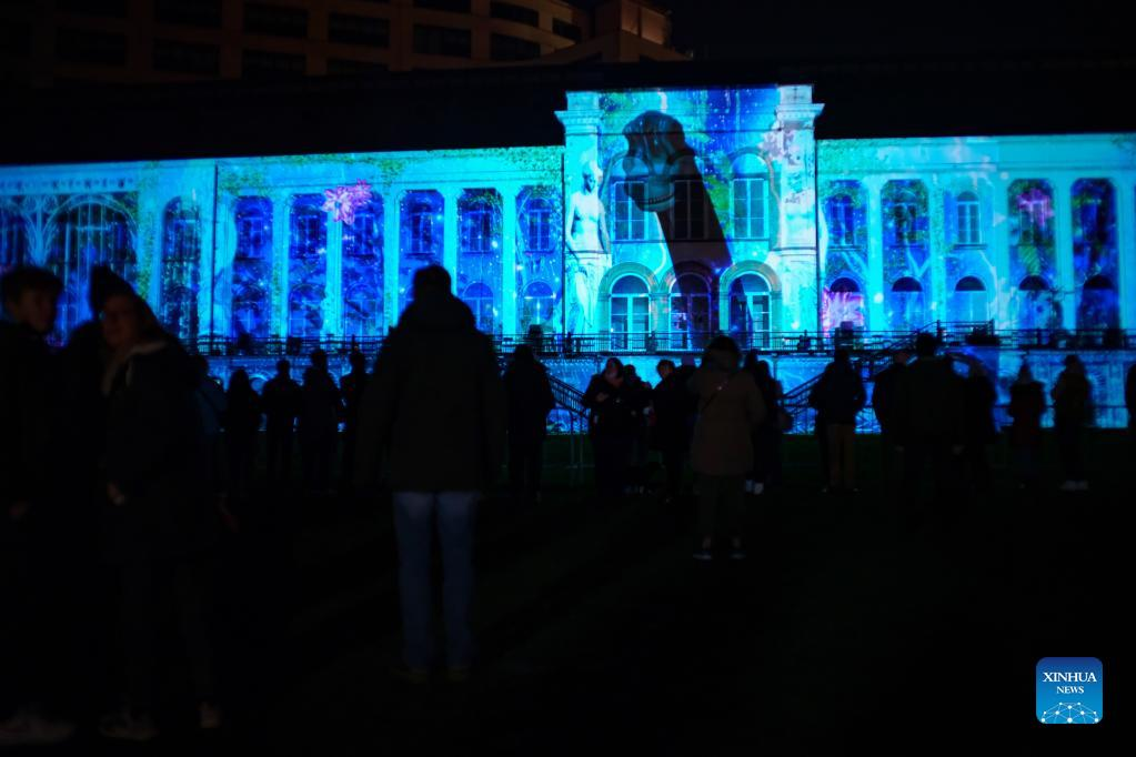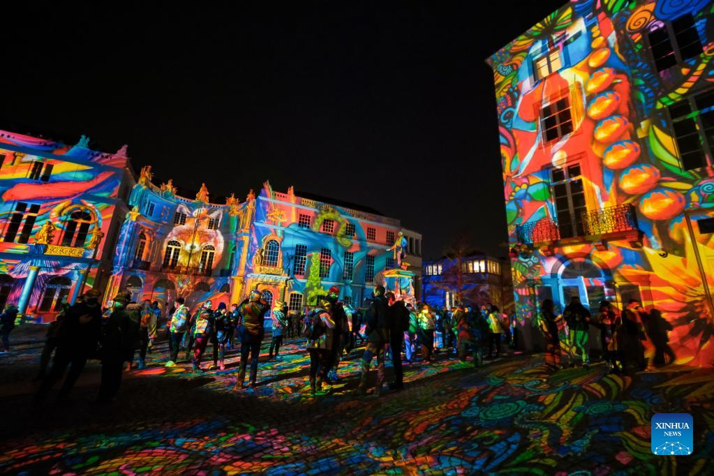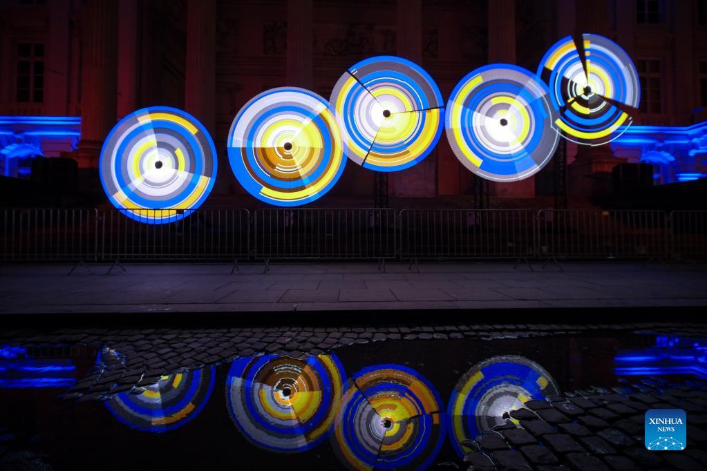 Photo taken on Feb. 10, 2022 shows artistic light installations during the Bright Brussels Festival in Brussels, capital of Belgium. (Xinhua/Zhang Cheng)