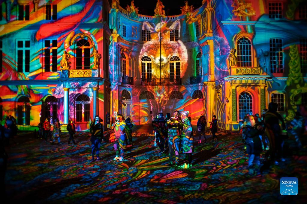 People watch a sound and light show during the Bright Brussels Festival in Brussels, capital of Belgium, Feb. 11, 2022. (Xinhua/Zhang Cheng)