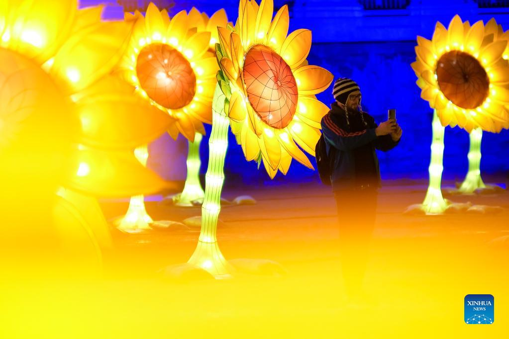 A man takes pictures of artistic light installations during the Bright Brussels Festival in Brussels, capital of Belgium, Feb. 10, 2022. (Xinhua/Zhang Cheng)