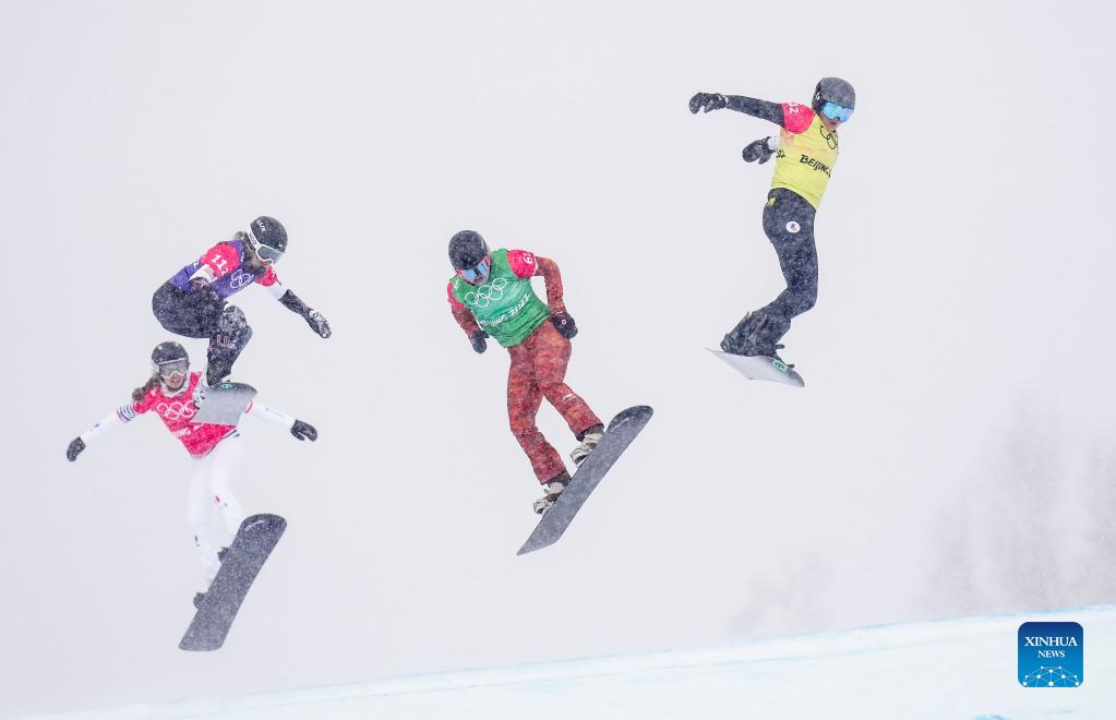 (R to L) Kristina Paul of ROC, Meryeta Odine of Canada, Faye Gulini of the United States and Chloe Trespeuch of France compete during the mixed team snowboard cross quaterfinals at Genting Snow Park in Zhangjiakou, north China's Hebei Province, Feb. 12, 2022. (Xinhua/Xu Chang)