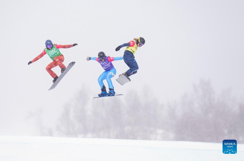 (R to L) Charlotte Bankes of Great Britain, Caterina Carpano of Italy and Tess Critchlow of Canada compete during the mixed team snowboard cross quaterfinals at Genting Snow Park in Zhangjiakou, north China's Hebei Province, Feb. 12, 2022. (Xinhua/Xu Chang)