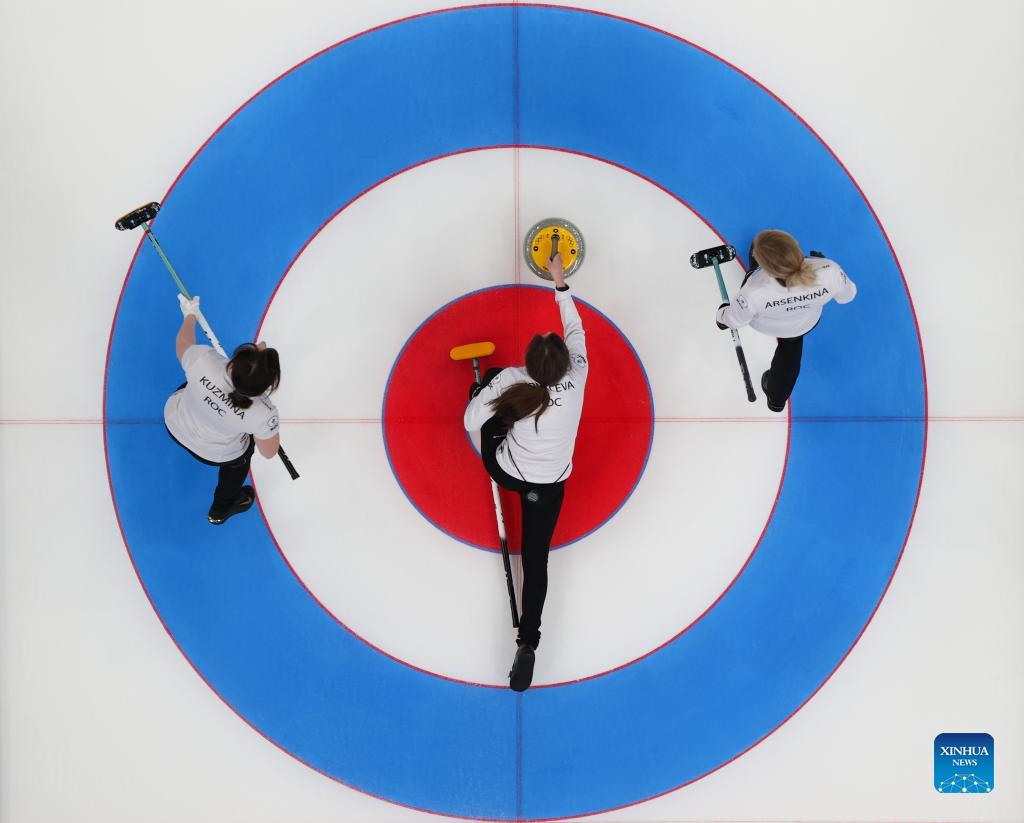 Ekaterina Kuzmina, Alina Kovaleva and Galina Arsenkina (from L to R) of ROC compete during curling women's robin session 4 of Beijing 2022 Winter Olympics between Republic of Korea and ROC at National Aquatics Centre in Beijing, capital of China, Feb. 12, 2022. (Xinhua/Wang Jingqiang)