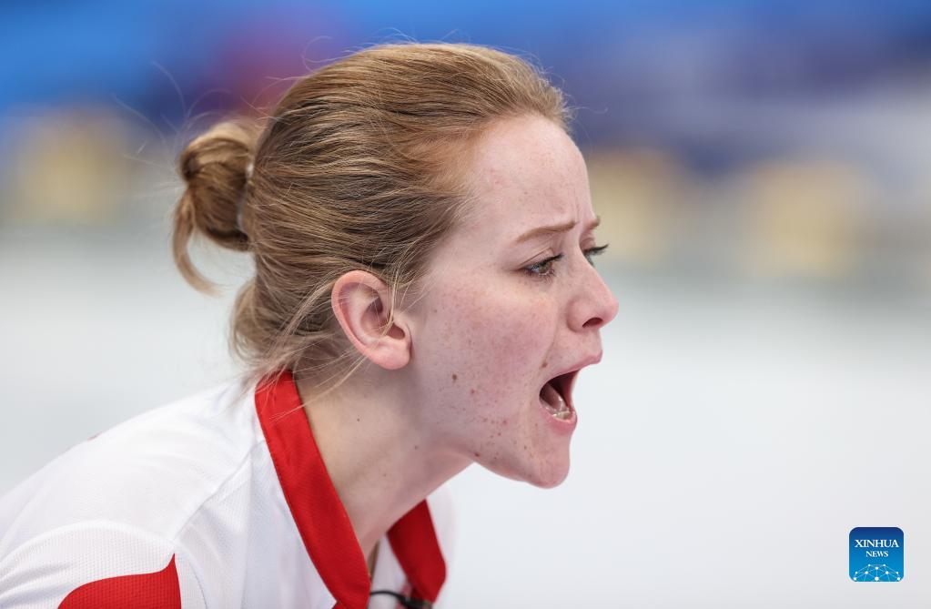 Mathilde Halse of Denmark competes during curling women's robin session 4 of Beijing 2022 Winter Olympics between Japan and Denmark at National Aquatics Centre in Beijing, capital of China, Feb. 12, 2022. (Xinhua/Yang Lei)