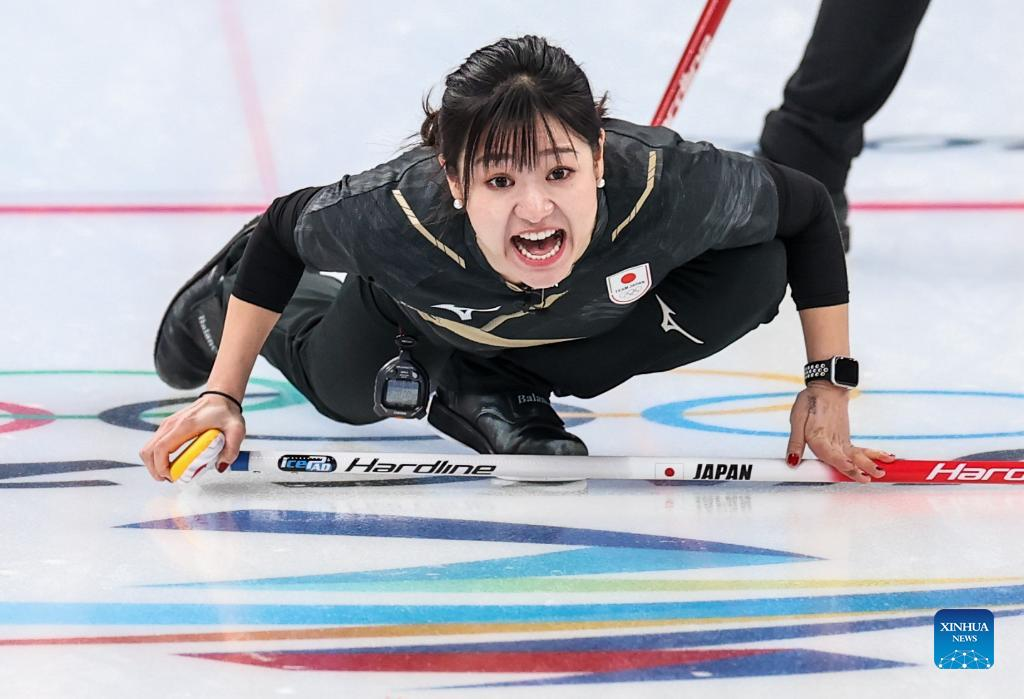 Yoshida Chinami of Japan competes during curling women's robin session 4 of Beijing 2022 Winter Olympics between Japan and Denmark at National Aquatics Centre in Beijing, capital of China, Feb. 12, 2022. (Xinhua/Yang Lei)