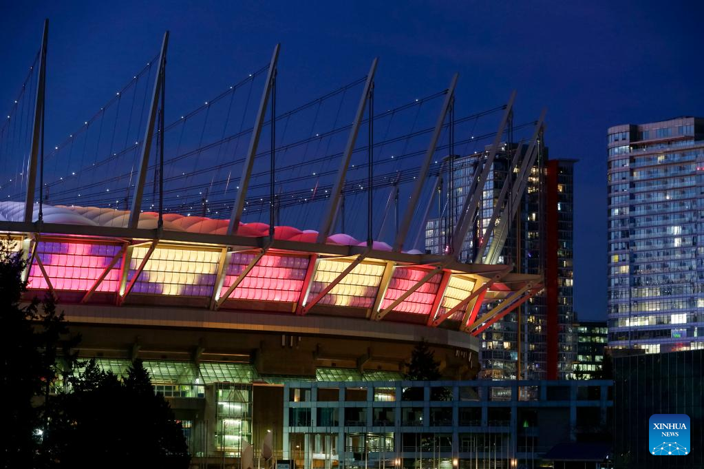 Photo taken on Feb. 11, 2022 shows artistic light installations during the outdoor art festival named "Winter Arts" outside BC Place Stadium in Vancouver, Canada. (Photo by Liang Sen/Xinhua)