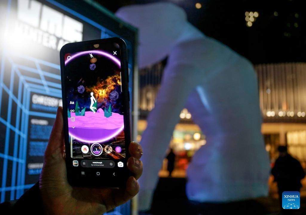A piece of AR technology artwork is displayed from the screen of a phone during the outdoor art festival named "Winter Arts" outside Vancouver Art Gallery in Vancouver, Canada on Feb. 11, 2022. (Photo by Liang Sen/Xinhua)