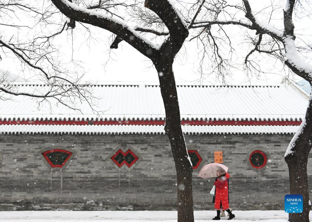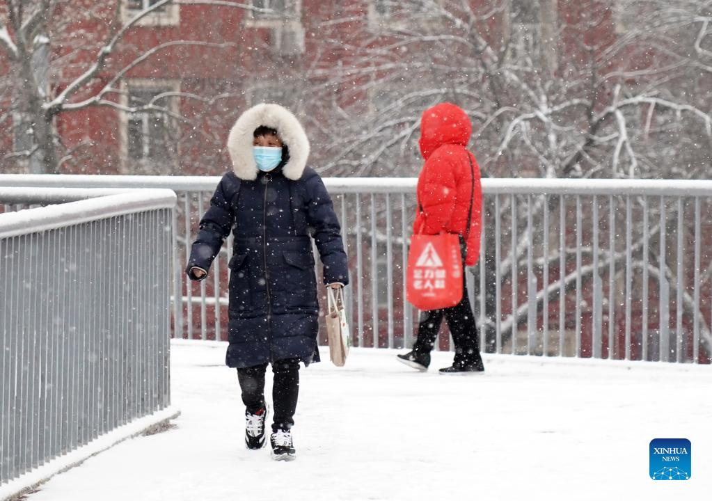 People walk on the street in snow in Beijing, capital of China, Feb. 13, 2022. A snowfall hit Beijing on Sunday. (Xinhua/Song Weiwei)