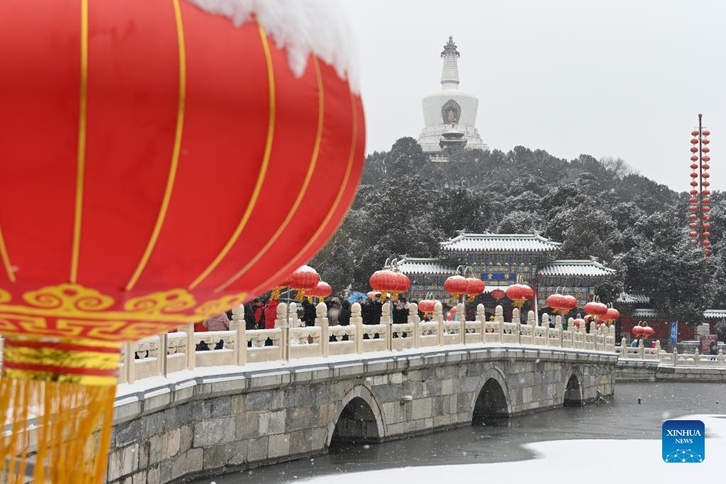 People enjoy the snow view at Beihai Park in Beijing, capital of China, Feb. 13, 2022. A snowfall hit Beijing on Sunday. (Xinhua/Song Weiwei)