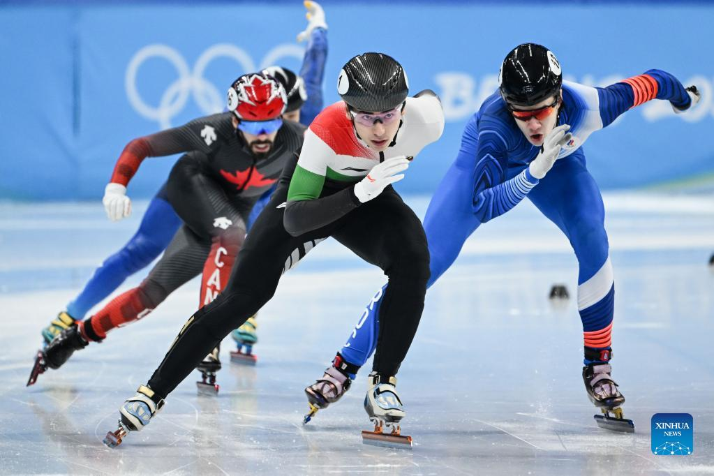 Shaoang Liu (C) of Hungary competes during the men's 500m short track speed skating final at Capital Indoor Stadium in Beijing, capital of China, Feb. 13, 2022. (Xinhua/Ju Huanzong)