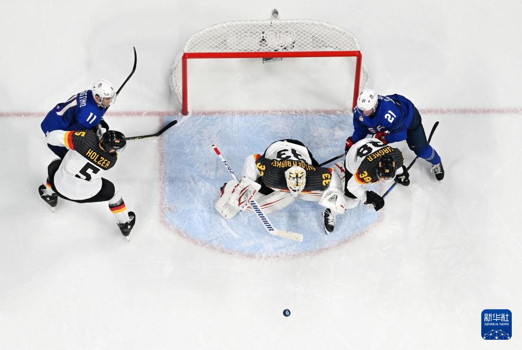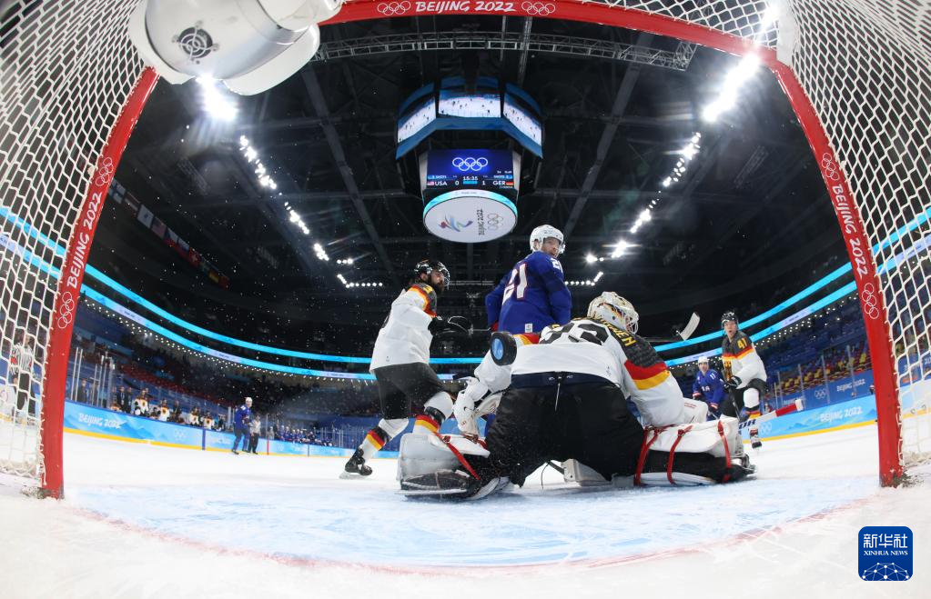 Goalkeeper Danny aus den Birken (front) of Germany misses a goal during the ice hockey men's preliminary round Group A match between the United States and Germany at Wukesong Sports Centre in Beijing, capital of China, Feb. 13, 2022. (Xinhua/Song Yanhua)