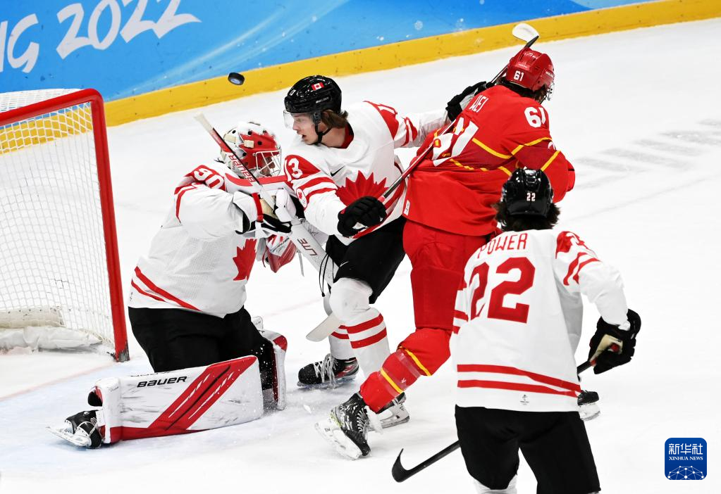 Athletes vie for the puck during the ice hockey men's preliminary round Group A match between China and Canada at National Indoor Stadium in Beijing, capital of China, Feb. 13, 2022. (Xinhua/Li Ziheng)