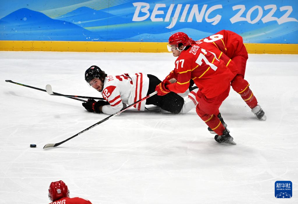 Luo Jia (2nd R) of China vies for the puck during the ice hockey men's preliminary round Group A match between China and Canada at National Indoor Stadium in Beijing, capital of China, Feb. 13, 2022. (Xinhua/Du Yu)