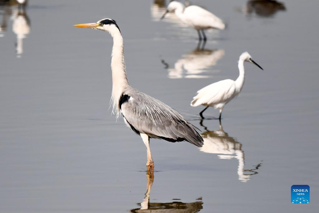 Birds forage at a beach in Jahra Governorate, Kuwait, Feb. 12, 2022. (Photo by Ghazy Qaffaf/Xinhua)