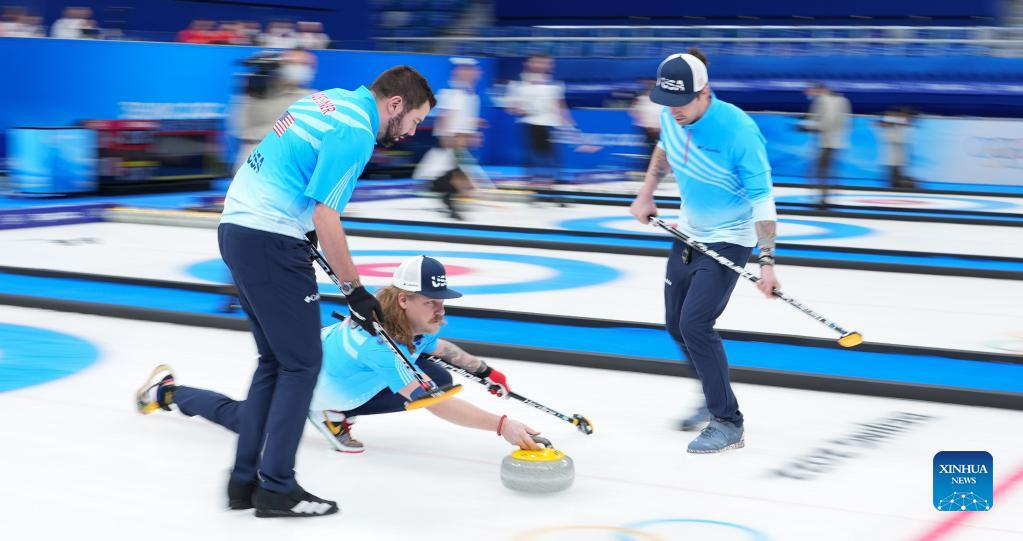 John Shuster (C) of the United States competes during the curling men's round robin session 7 of the Beijing 2022 Winter Olympics between China and the United States at National Aquatics Centre in Beijing, capital of China, Feb. 13, 2022. (Xinhua/Li He)