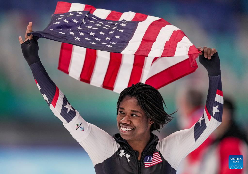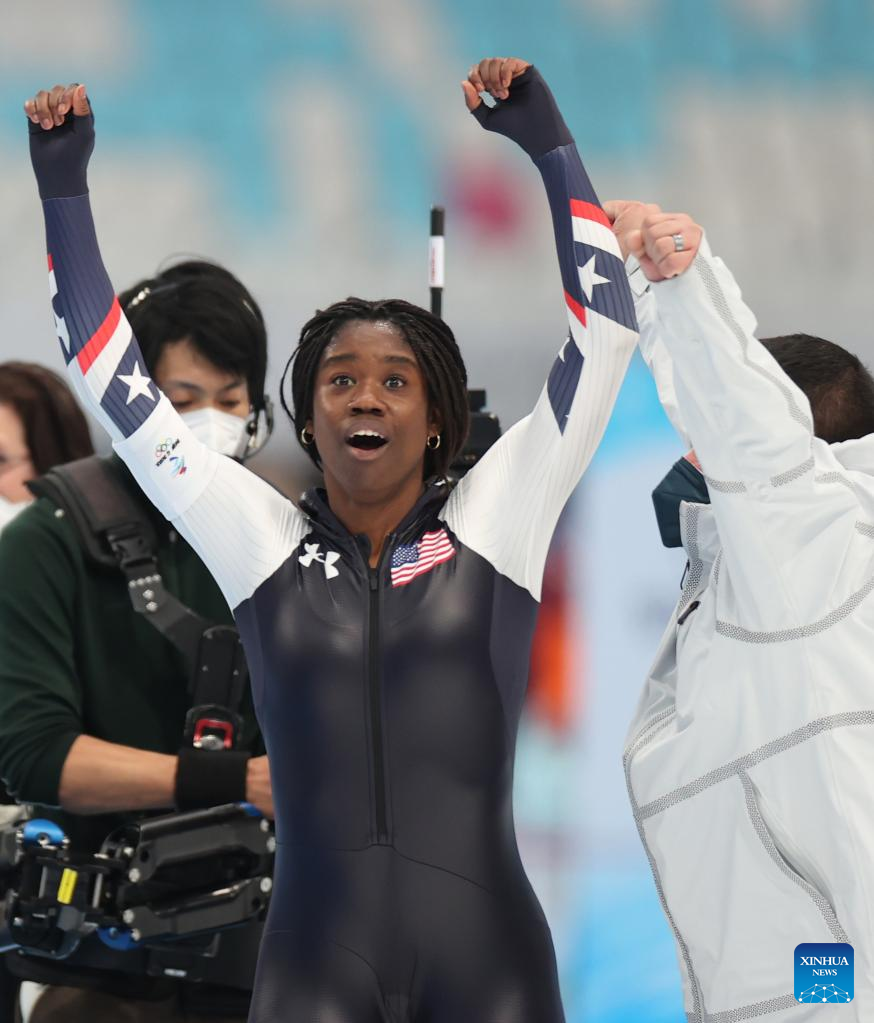 Erin Jackson of the United States celebrates after winning speed skating women's 500m at the National Speed Skating Oval in Beijing, capital of China, Feb. 13, 2022. (Xinhua/Wang Fei)