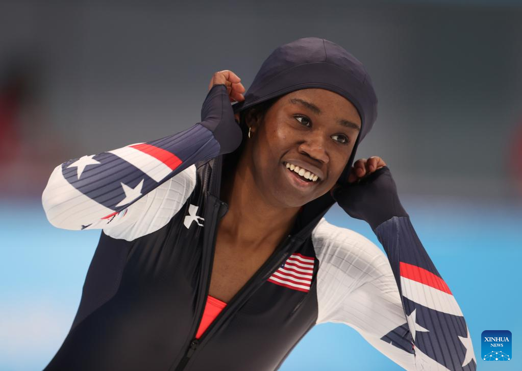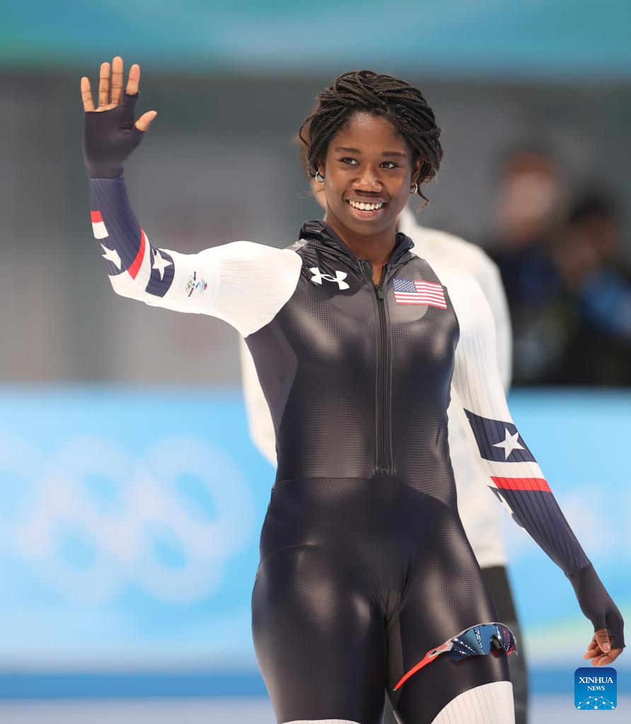 Erin Jackson of the United States poses after speed skating women's 500m at the National Speed Skating Oval in Beijing, capital of China, Feb. 13, 2022. (Xinhua/Ding Xu)
