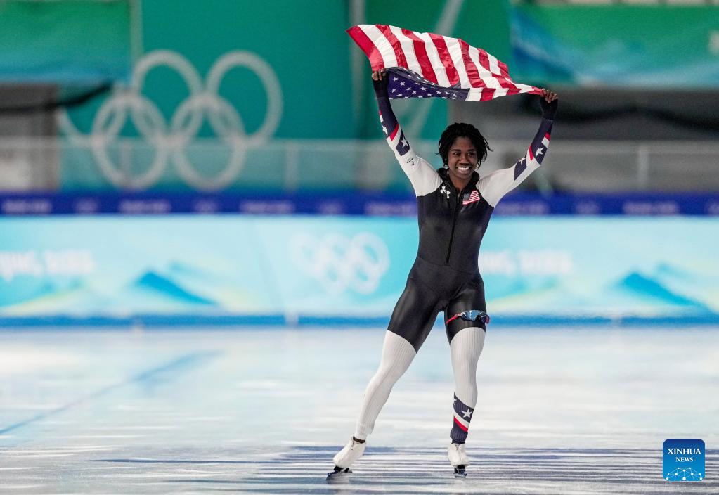Erin Jackson of the United States celebrates after winning speed skating women's 500m at the National Speed Skating Oval in Beijing, capital of China, Feb. 13, 2022. (Xinhua/Ding Xu)