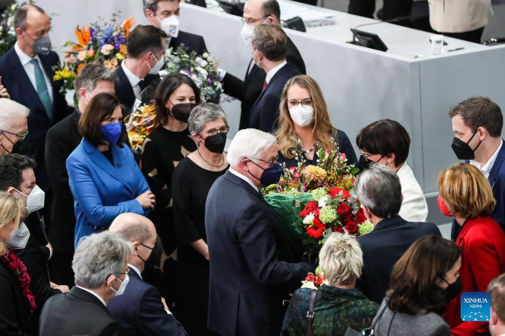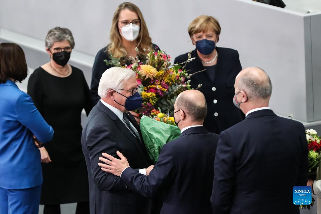 Frank-Walter Steinmeier (C) is congratulated after his re-election as president of the Federal Republic of Germany during the 17th Federal Convention in Berlin, capital of Germany, Feb. 13, 2022. Steinmeier was re-elected as German president on Sunday. (Xinhua/Shan Yuqi)