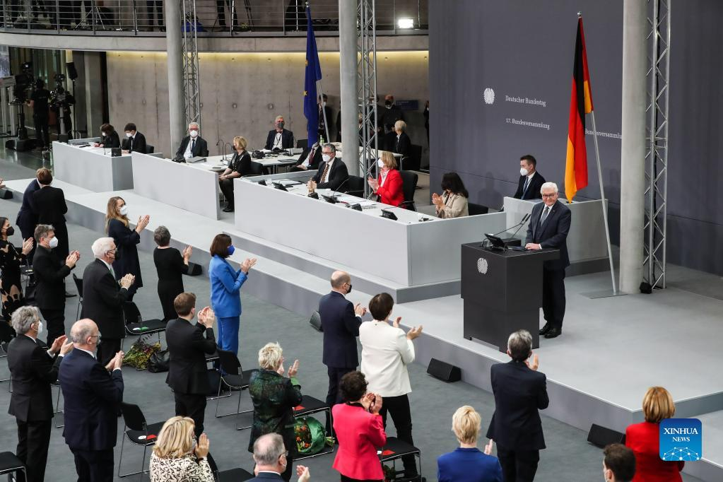 Frank-Walter Steinmeier receives applause after delivering a speech during the 17th Federal Convention in Berlin, capital of Germany, Feb. 13, 2022. Steinmeier was re-elected as German president on Sunday. (Xinhua/Shan Yuqi)