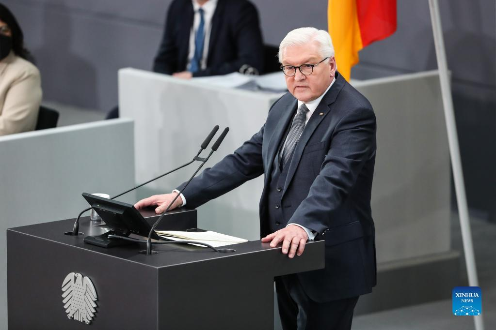 Frank-Walter Steinmeier delivers a speech after his re-election as president of the Federal Republic of Germany during the 17th Federal Convention in Berlin, capital of Germany, Feb. 13, 2022. Steinmeier was re-elected as German president on Sunday. (Xinhua/Shan Yuqi)