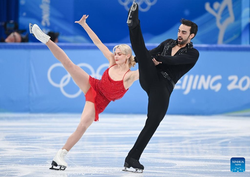 Olivia Smart (L) and Adrian Diaz of Spain perform during the figure skating ice dance rhythm dance at Capital Indoor Stadium in Beijing, capital of China, Feb. 12, 2022. (Xinhua/Ma Ning)