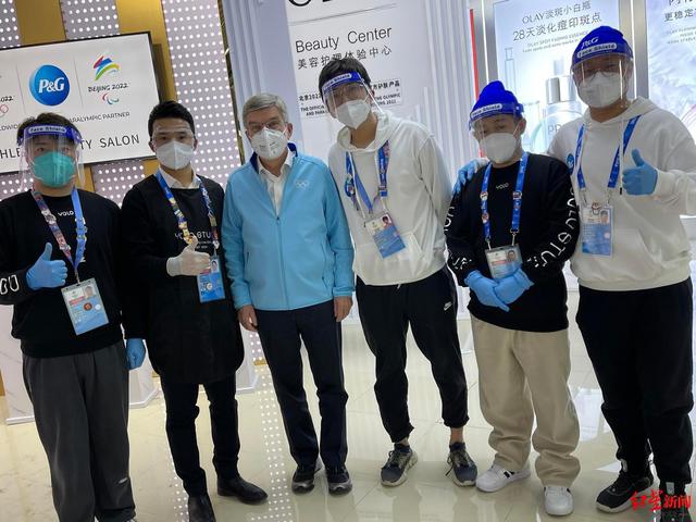 Thomas Bach poses for a photo with staff members in Zhu's salon in the Olympic Village. (Photo/Chengdu.cn)