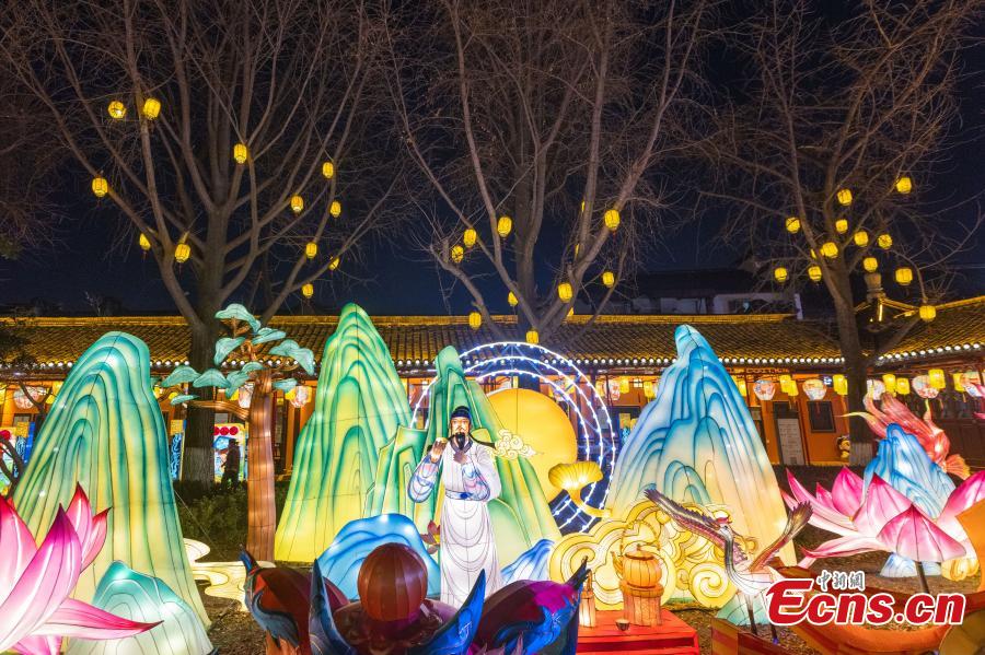 People view lanterns ahead of the Lantern Festival at Nanjing Confucius Temple (Fuzimiao) in east China's Jiangsu Province, Feb. 13, 2022. The Lantern Festival, celebrated on the 15th day of the first month of the Chinese lunar calendar, falls on Tuesday this year. It features family reunions, feasts and various cultural activities. (Photo: China News Service/Yang Bo)
