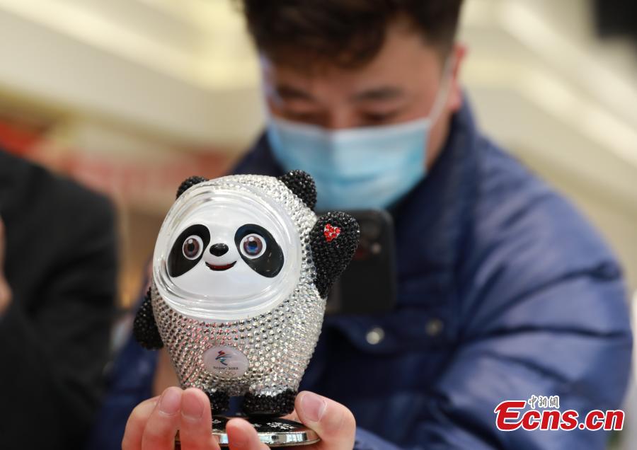 A diamond-encrusted Bing Dwen Dwen, mascot of Beijing 2022 Winter Olympics, is on display at an authorized merchandise store in Zhengzhou, Central China's Henan Province, Feb. 14, 2022. (Photo: China News Service/Kan Li)
