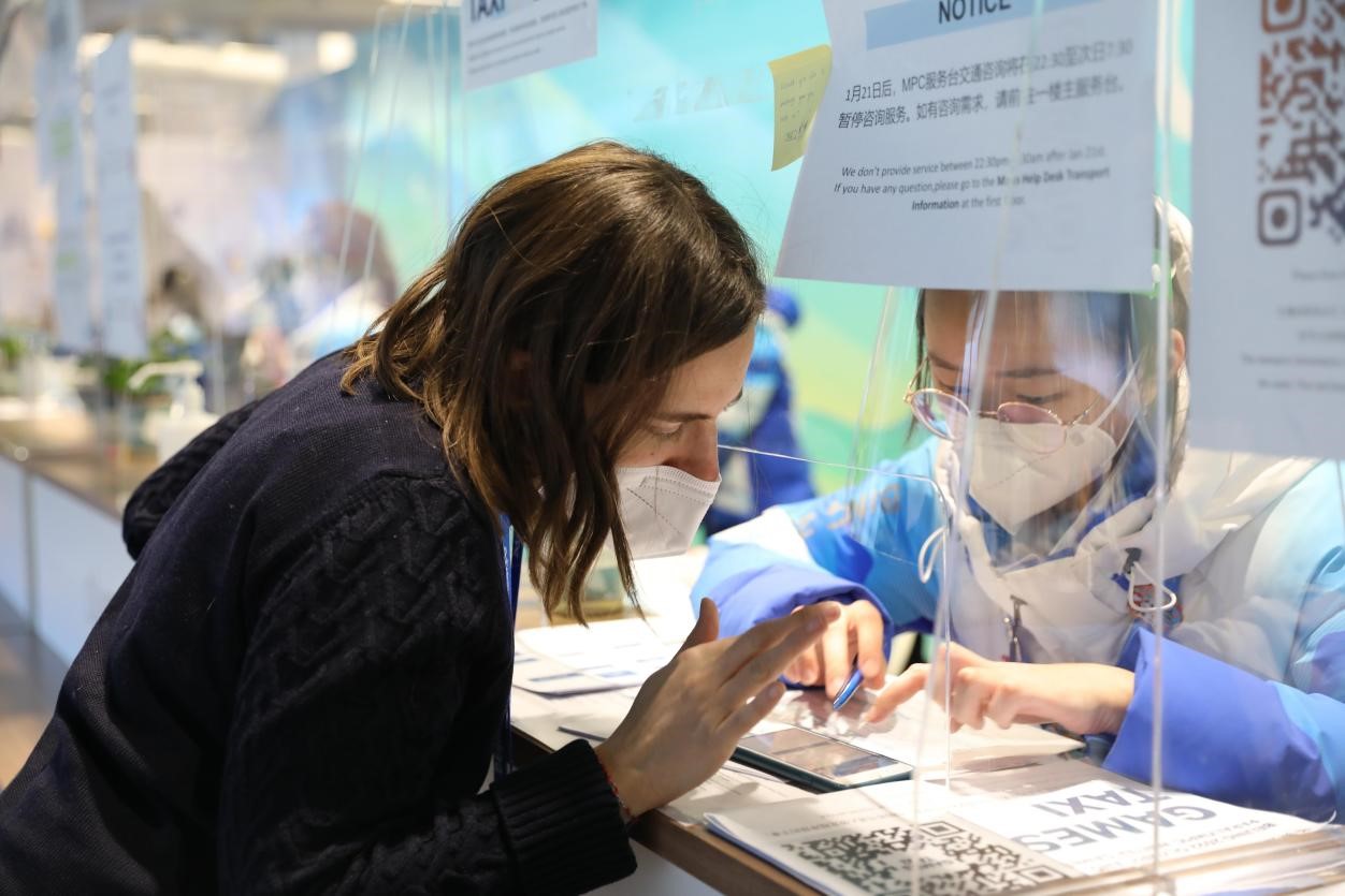 An Olympic volunteer provides transportation information for a foreign journalist at the service desk of the Main Media Center (MMC) for the Beijing Winter Olympics, Feb. 3, 2022. (People’s Daily Online/Chen Shangwen)