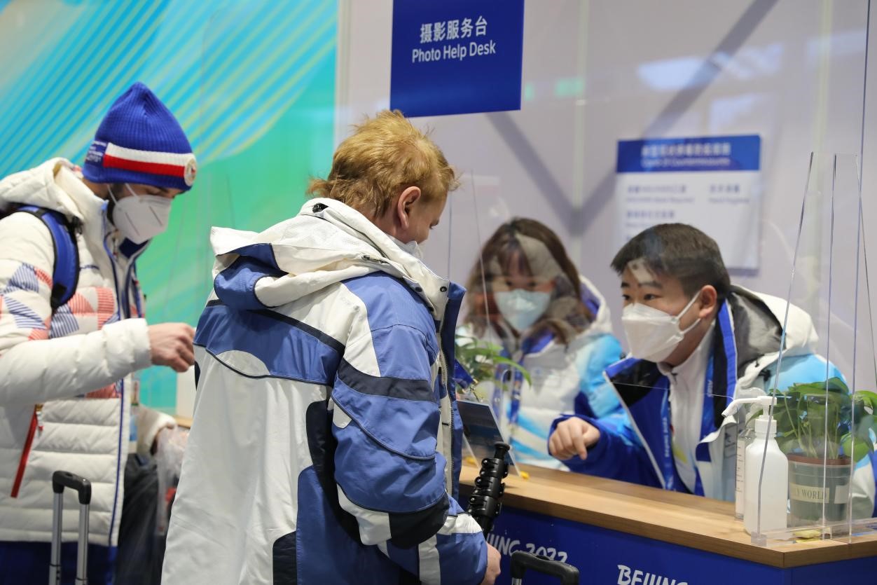 Olympic volunteers help foreign journalists at the Photo Help Desk of the Main Media Center (MMC) for the Beijing Winter Olympics, Feb. 3, 2022. (People’s Daily Online/Chen Shangwen)