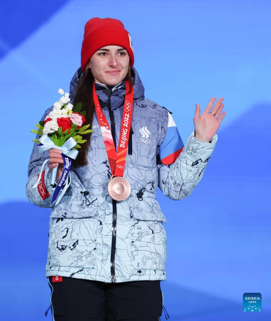 Bronze medalist Angelina Golikova of ROC reacts during the awarding ceremony of speed skating women's 500m at the Beijing Medals Plaza of the Winter Olympics in Beijing, capital of China, Feb. 14, 2022. (Xinhua/Cao Can)