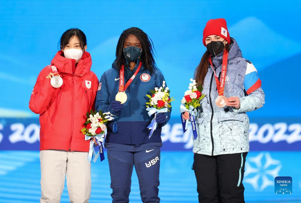 Gold medalist Erin Jackson (C) of the United States, silver medalist Takagi Miho (L) of Japan and bronze medalist Angelina Golikova of ROC pose during the awarding ceremony of speed skating women's 500m at the Beijing Medals Plaza of the Winter Olympics in Beijing, capital of China, Feb. 14, 2022. (Xinhua/Yang Lei)
