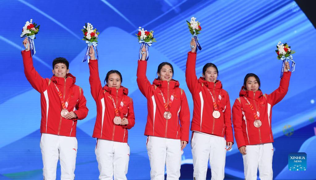 Bronze medalists of China pose during the awarding ceremony of short track speed skating women's 3000m relay at the Beijing Medals Plaza of the Winter Olympics in Beijing, capital of China, Feb. 14, 2022. (Xinhua/Cao Can)