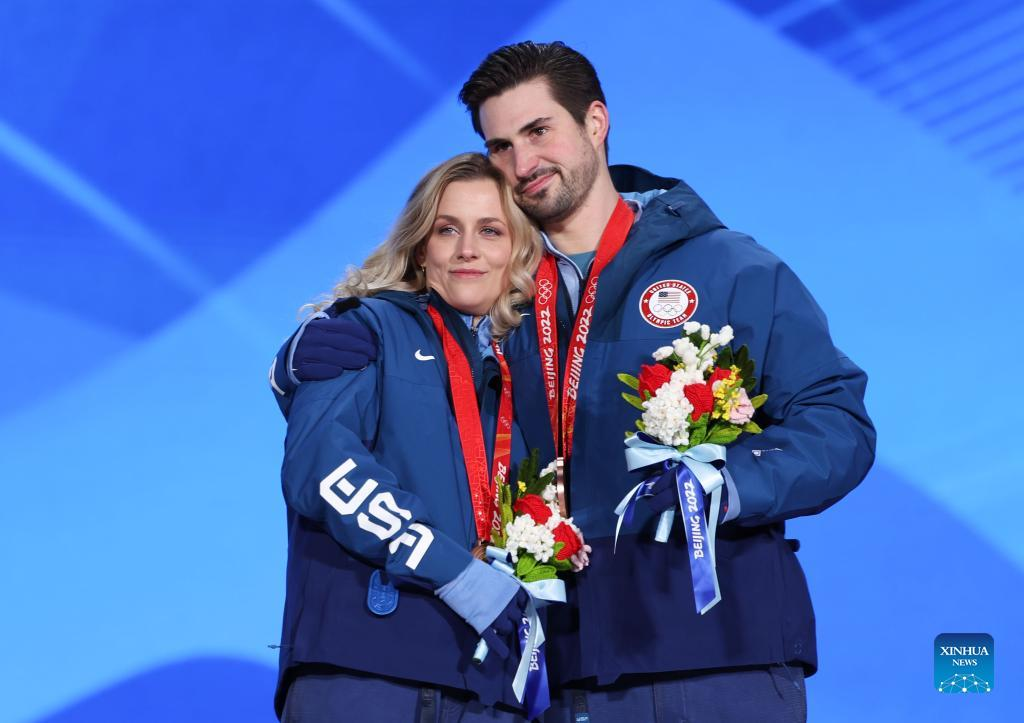 Bronze medalists Madison Hubbell/Zachary Donohue of the United States react during the awarding ceremony of figure skating ice dance free dance at the Beijing Medals Plaza of the Winter Olympics in Beijing, capital of China, Feb. 14, 2022. (Xinhua/Cao Can)