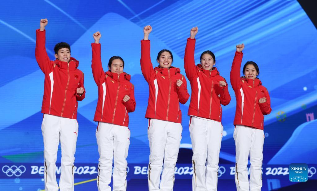 Medalists pose during the awarding ceremony of short track speed skating women's 3000m relay at the Beijing Medals Plaza of the Winter Olympics in Beijing, capital of China, Feb. 14, 2022. (Xinhua/Cao Can)