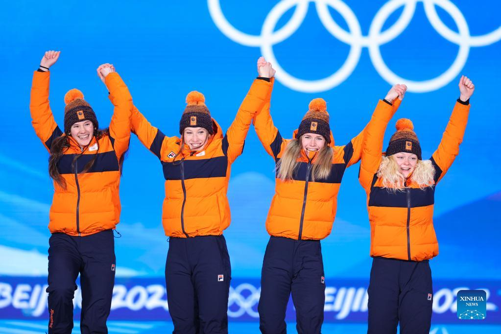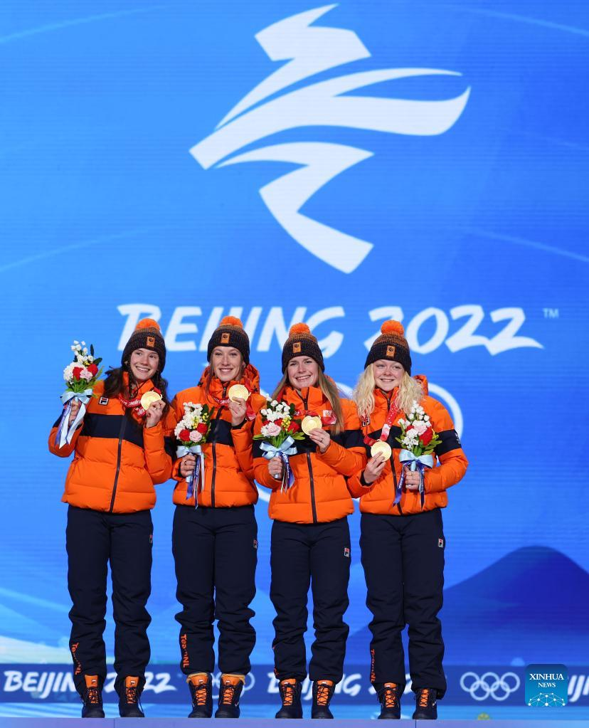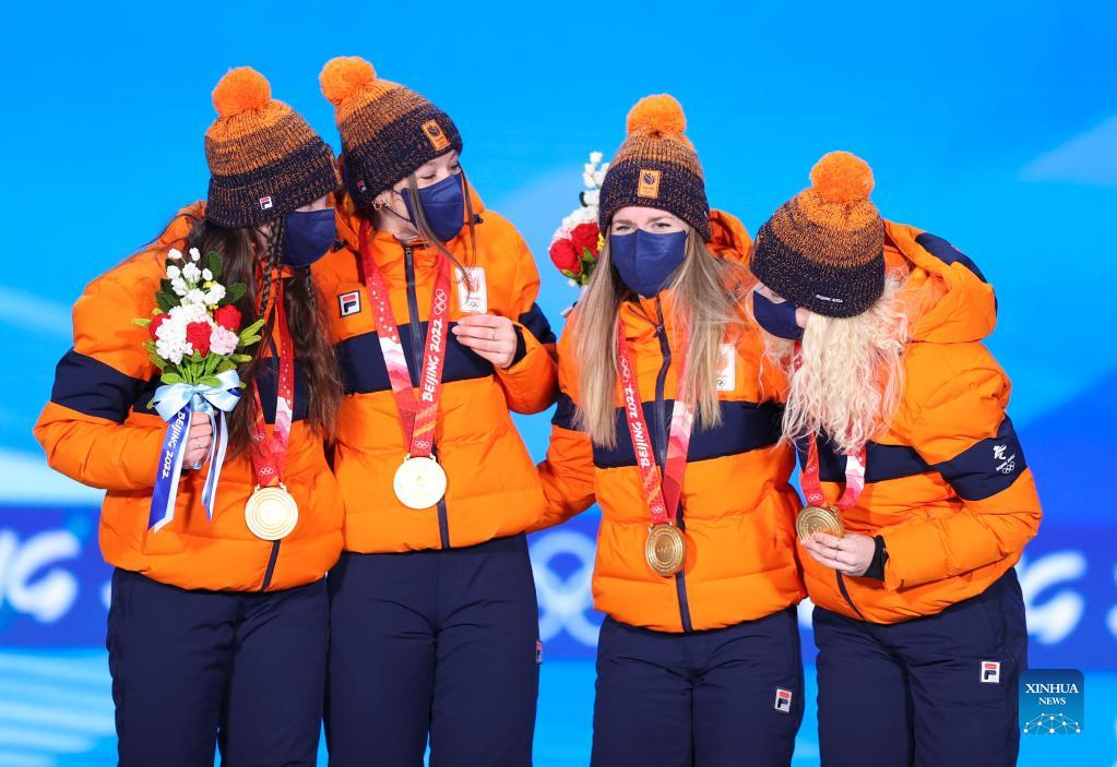 Gold medalists of the Netherlands react during the awarding ceremony of short track speed skating women's 3000m relay at the Beijing Medals Plaza of the Winter Olympics in Beijing, capital of China, Feb. 14, 2022. (Xinhua/Yang Lei)