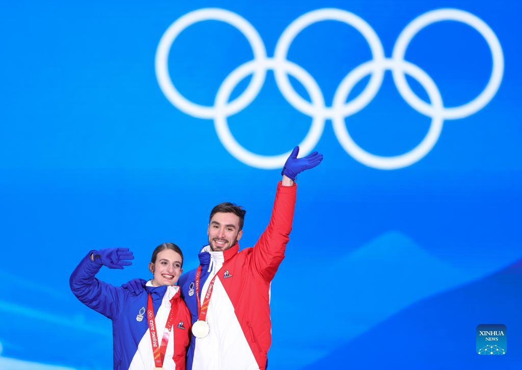 Gold medalists Gabriella Papadakis/Guillaume Cizeron of France react during the awarding ceremony of figure skating ice dance free dance at the Beijing Medals Plaza of the Winter Olympics in Beijing, capital of China, Feb. 14, 2022. (Xinhua/Yang Lei)