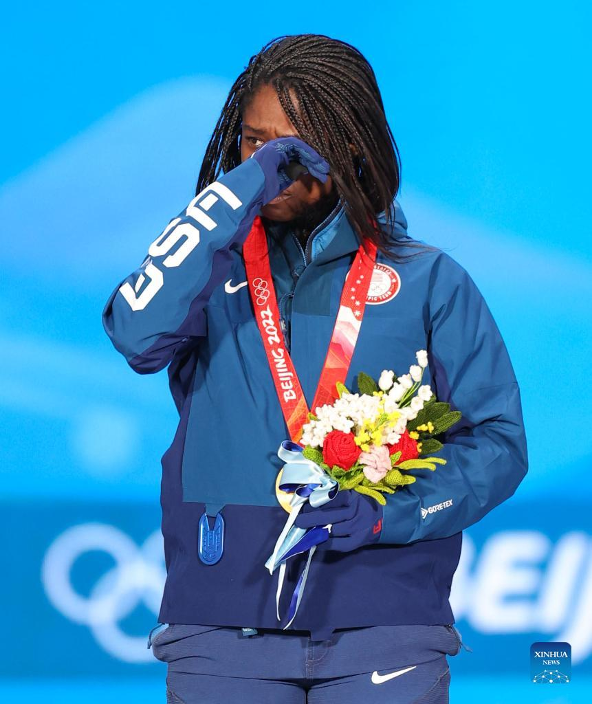 Gold medalist Erin Jackson of the United States reacts during the awarding ceremony of speed skating women's 500m at the Beijing Medals Plaza of the Winter Olympics in Beijing, capital of China, Feb. 14, 2022. (Xinhua/Yang Lei)